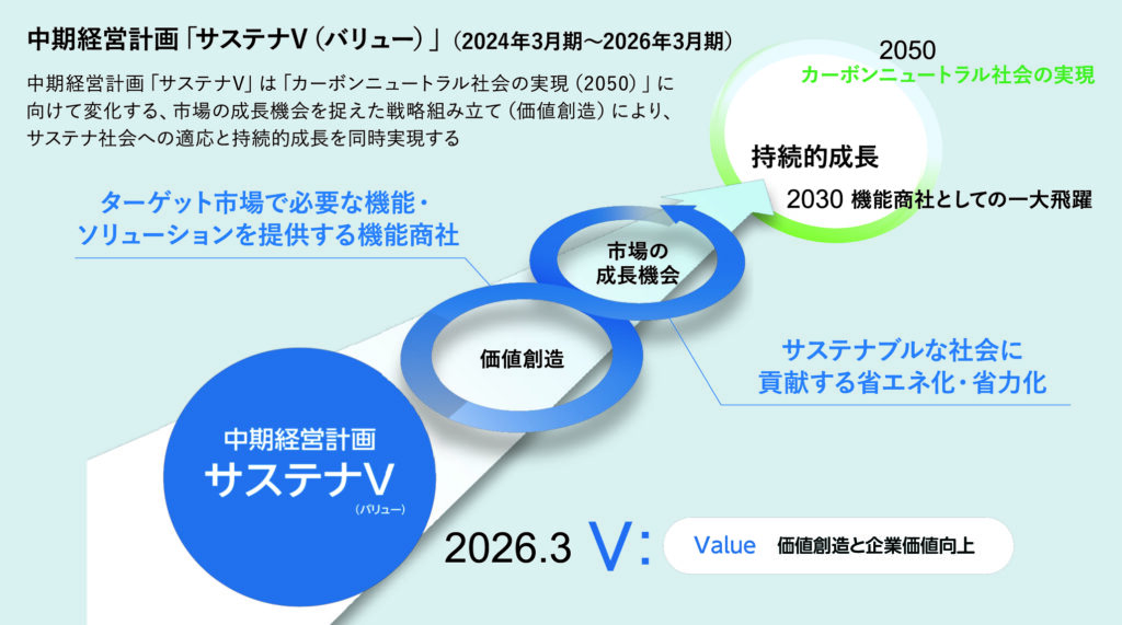 高島の中期経営計画「サステナV(バリュー)」では、成長テーマとして「省エネ化」「省力化」が明確に掲げられている。