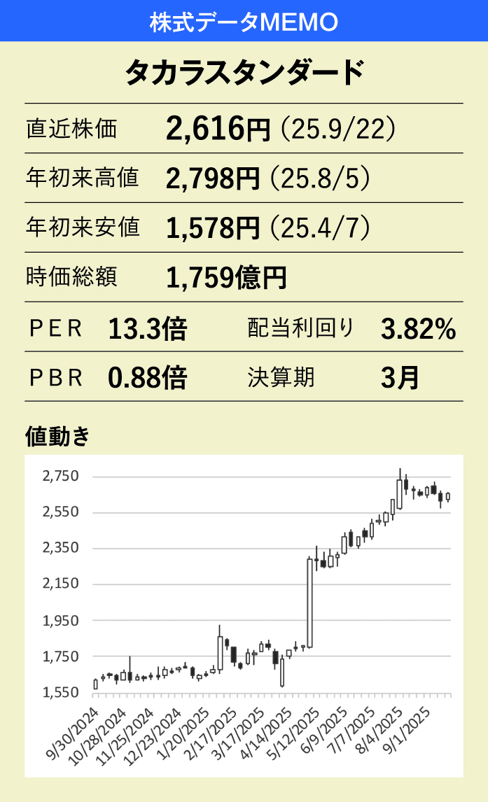 住宅市場は年々新築着工数が減少しており、今後も市場は縮小が見込まれている。ピークに年間160万戸以上あった新築着工数はすでに80万戸を割り込んでおり、今後60万戸まで減少する予測もある。一方でリフォーム市場も年率2%程度の成長しか見込まれておらず、住宅マーケットは全体に厳しい状況が続きそうだ。こうした状況で、キッチン、バスなどの住宅設備機器を扱う大手のタカラスタンダードが堅調に業績を伸ばしている。