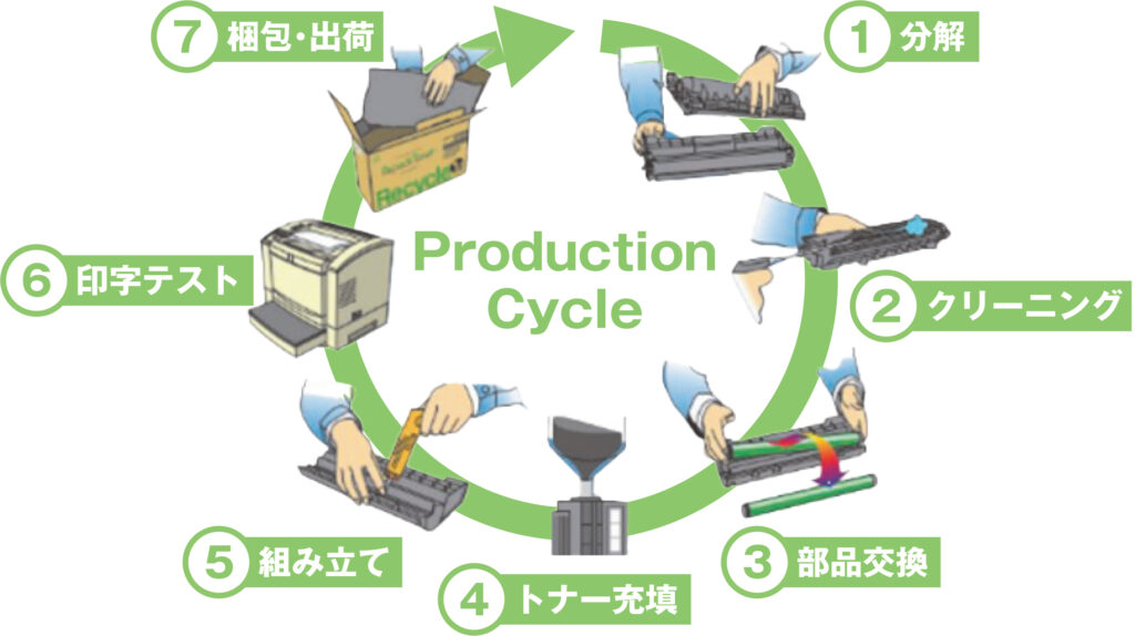 リユーストナーとは、使用済みカートリッジを回収し、分解・洗浄・部品交換・再組立する製品。調達コストの圧縮・廃棄物の削減が見込める。