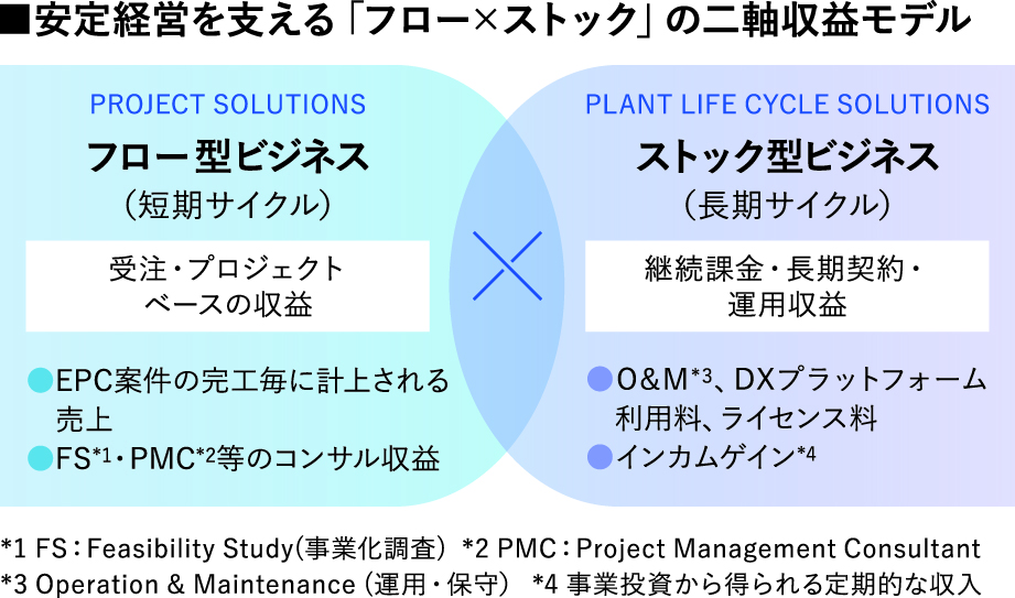 「事業環境の変革期にあたり、2040年に向けて描いたのが『フロー』と『ストック』の2軸による収益構造です。これまでに培ってきたEPCの技術は当社の財産であり差別化の源泉です。長期経営ビジョンでは、このフロー型ビジネスであるEPCをストックビジネス獲得への『入口』、そしてストック型ビジネスを経営の安定性を支える、毎年安定的に利益を生む『柱』と位置付けました」(富永常務CTO)