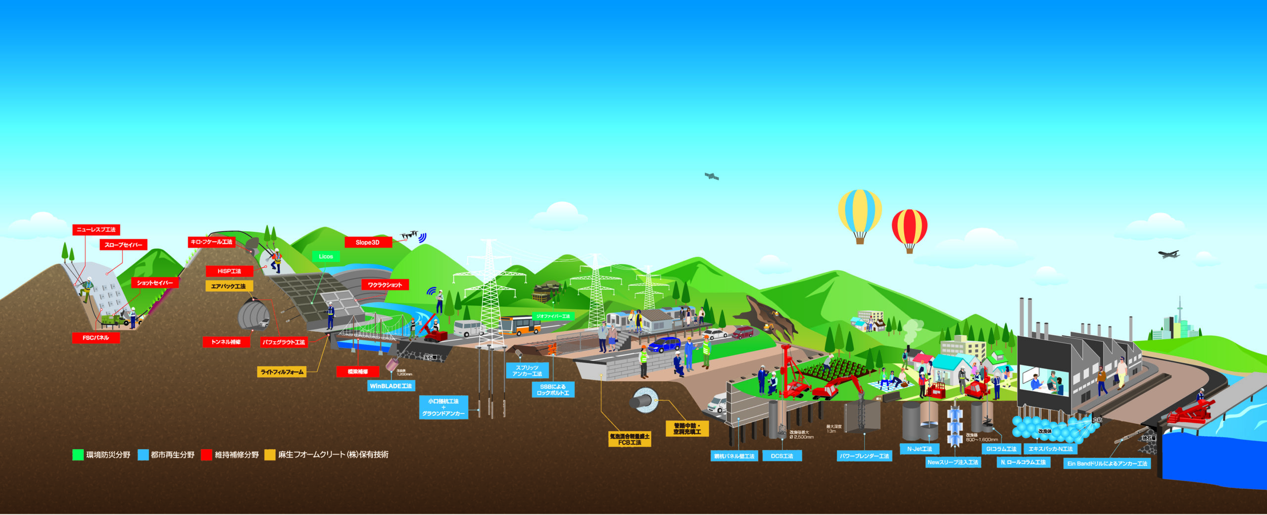 例えば、山間部や道路脇などでよく見られる法面(斜面)では、崩壊・土砂崩れ・落石・浸食を防ぐ法面工事において国内シェア1~2位を競う。地盤を強化する地盤改良工事は同3位。祖業のダム基礎工事では、国内の堤高100m以上のダムにおけるグラウチング(セメントミルクを基礎岩盤の割れ目に圧入し、遮水性の向上と地盤強化を図る)にて8割以上の施工実績を誇る。