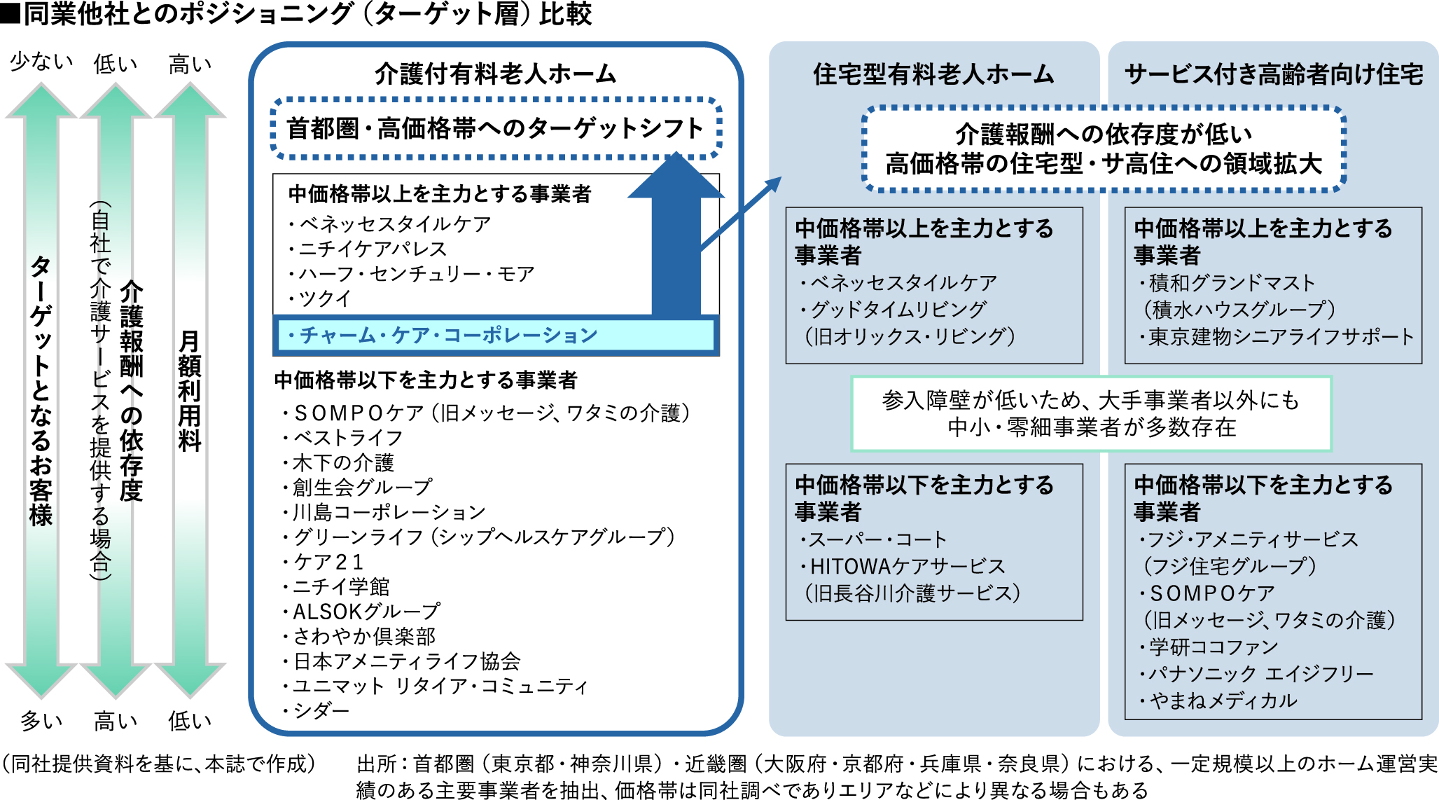2000年に介護保険制度がスタートして以降、SOMPO、ベネッセ、学研をはじめとする大手企業や新興企業も含めて、多数の企業がこのマーケットに参入している。