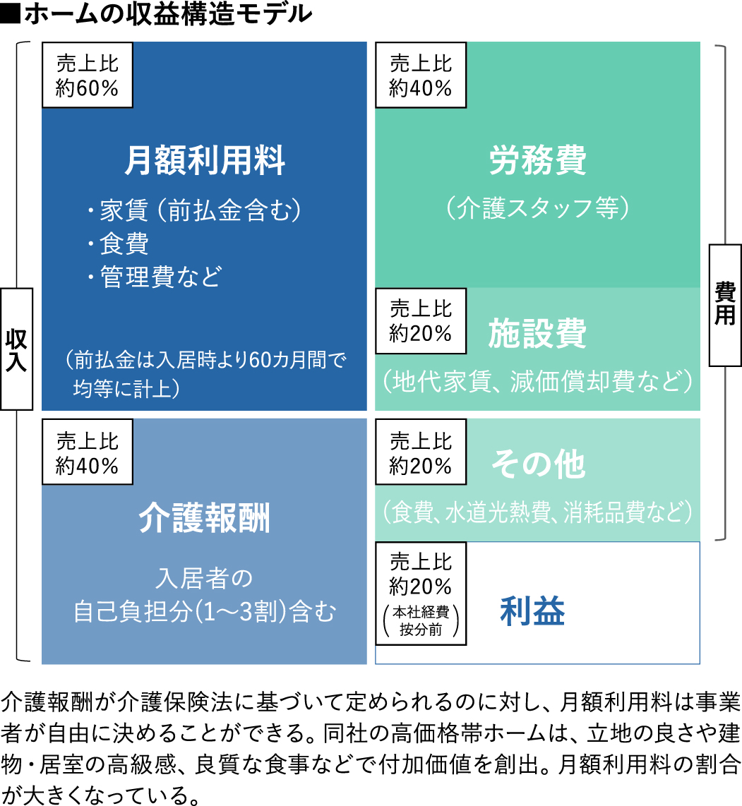 また介護事業を営みながらも、介護保険報酬への依存度が低い経営を行っていることも、同社の特徴だ。在宅介護のビジネスの特徴は、その収入のほとんどを介護報酬でまかなっていることだが、同社においては、その介護保険報酬を上回るのが、保険外収入にあたる家賃や食費などの月額利用料だ。同社の標準的な事業モデルでは、売上高に占める月額利用料が6割、介護報酬が4割となっている。月額利用料の金額はホームによって幅があるが、高価格のホームになるほど、売上高に占める月額利用料の割合が大きくなる。