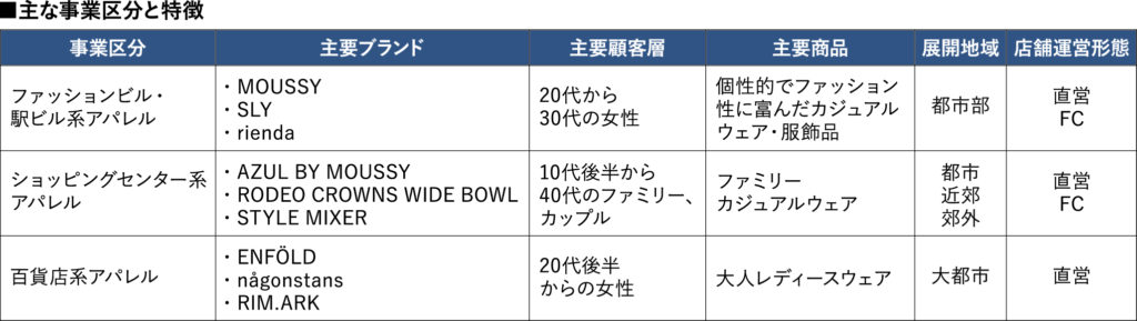 主なブランドには、20代から30代の女性に向けた「MOUSSY」「SLY(スライ)」「rienda(リエンダ)」や、10代後半から40代のファミリーやカップルに向けた「RODEO CROWNS WIDE BOWL(ロデオクラウンズワイドボウル)」などがある。また「SHEL‘TTER(シェルター)」の名称でECも展開している。