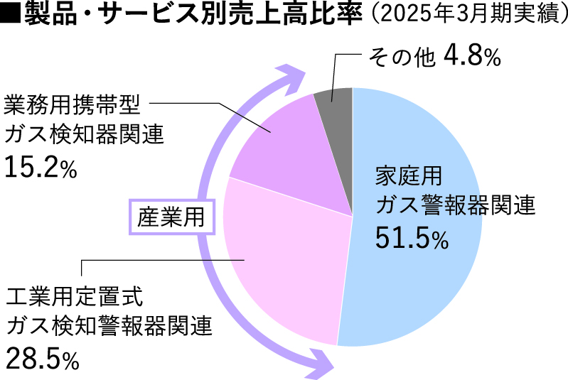 国内において、家庭用と産業用双方を手掛けるメーカーは同社のみである。25年3月期の売上高構成は、「家庭用ガス警報器関連」が51・5%、産業用が43・7%(「工業用定置式ガス検知警報器関連」28・5%、「業務用携帯型ガス検知器関連」15・2%を合算)、「その他」が4・8%となった。