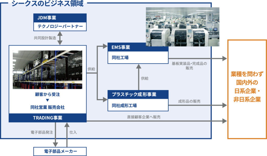 同社の強みは、電子部品の調達から、設計、組立・生産、物流、アフターサービスまで一貫して顧客の需要に応えられることだ。事業としては、「EMS事業」と商社機能の「TRADING事業」に加え、パートナー企業と共同設計製造を行う「JDM事業」、プラスチック射出成形などを行う「プラスチック成形事業」の4つから成る。