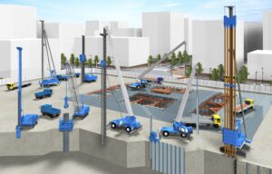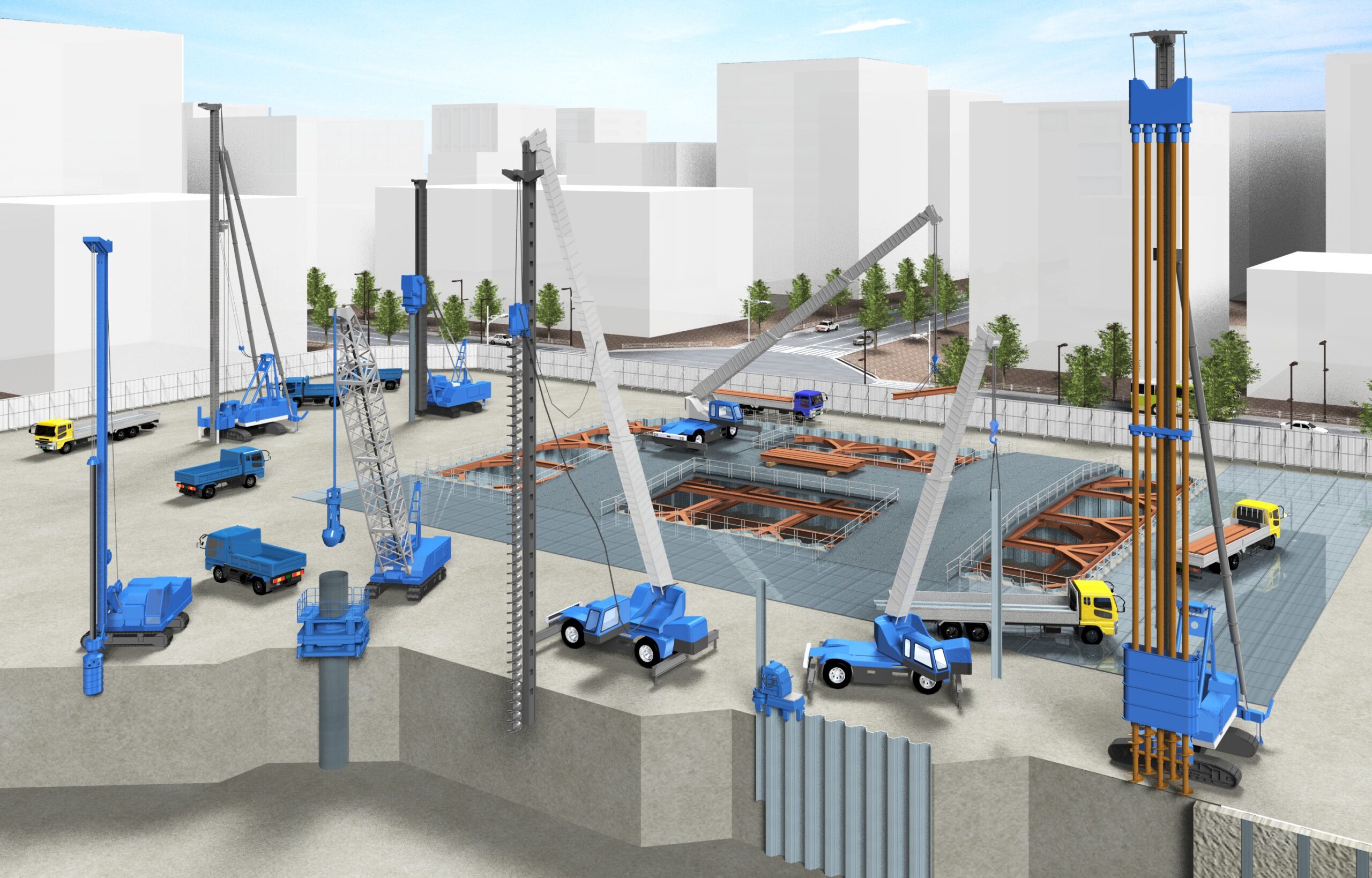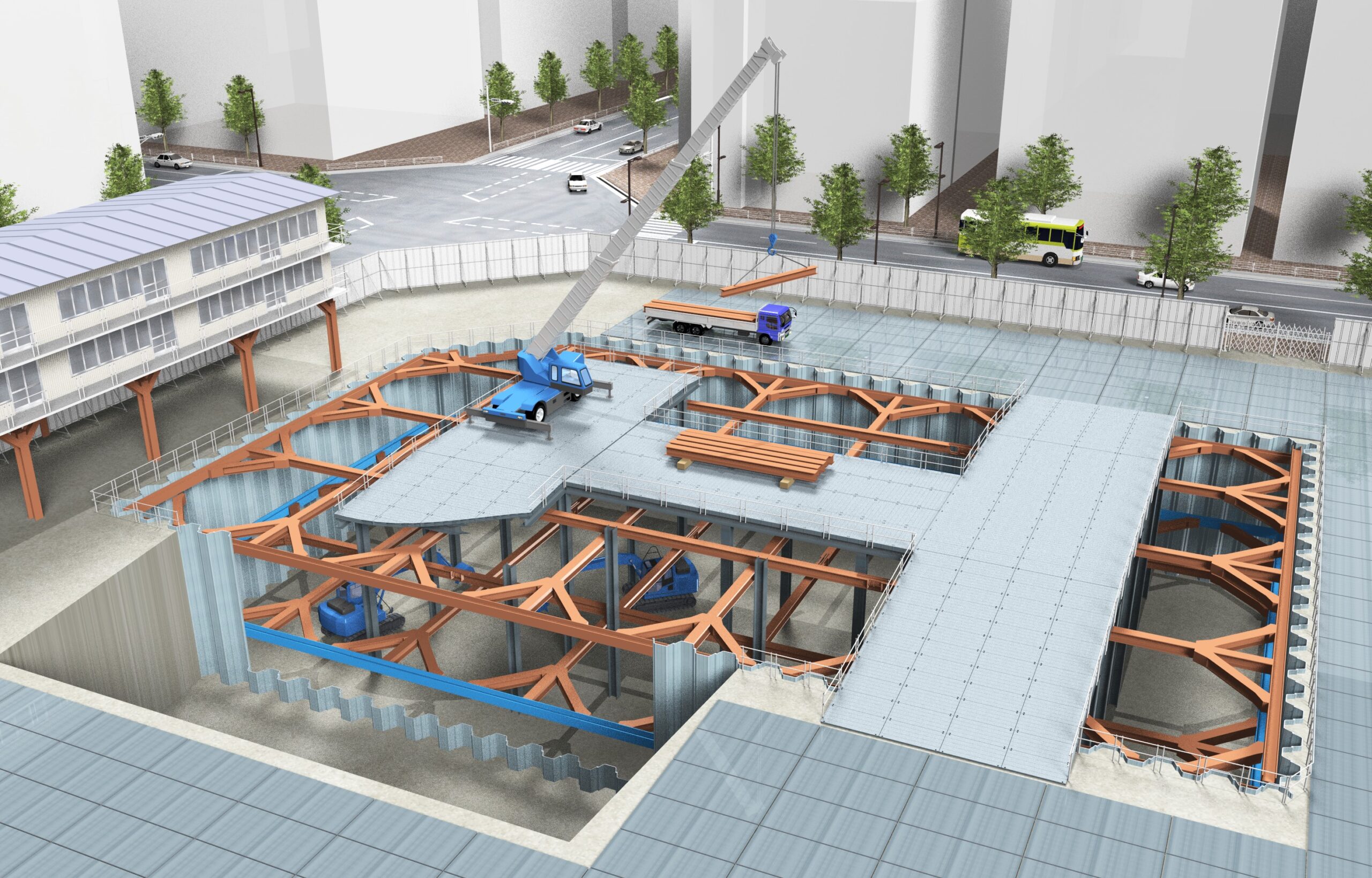 建設現場では地面を掘り下げて、地中にしっかりとした基礎を築く必要がある。しかしいきなり土を掘ると土砂が崩れるため、あらかじめ地中に土砂を押さえる鋼製の壁を作ってから地面を掘り下げる。さらに、鋼材を突っ張り棒のようにして、その壁を支える。