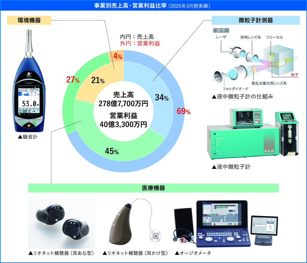 一方、騒音計、振動計などの環境機器は、自治体などの行政機関や建築業などの民間企業に販売される。家電・自動車などの製造業の現場でも、製品の騒音や振動を計測するために使用される。市場や顧客の異なる3事業を並行して展開することにより、外的環境の影響を受けたとしてもリスク分散できるため、経営の安定につながっている。